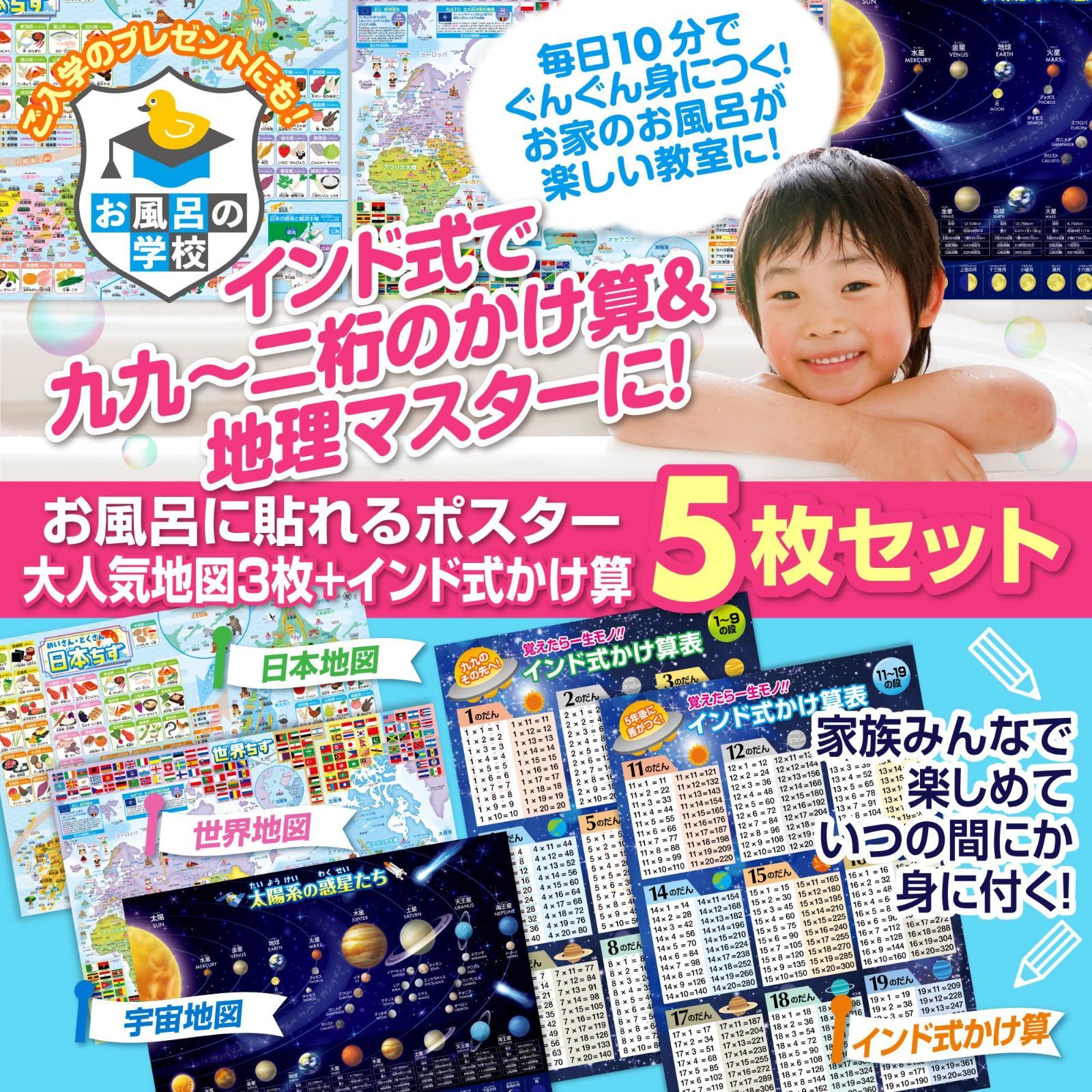 【特価セール】学習 知育 地理 社会 日本製 算数 お風呂ポスター2種類セット 九九 地図/インド式かけ算(1-9の段u002611-19の段)宇宙 B3サイズ セット価格 防水 お風呂の学校