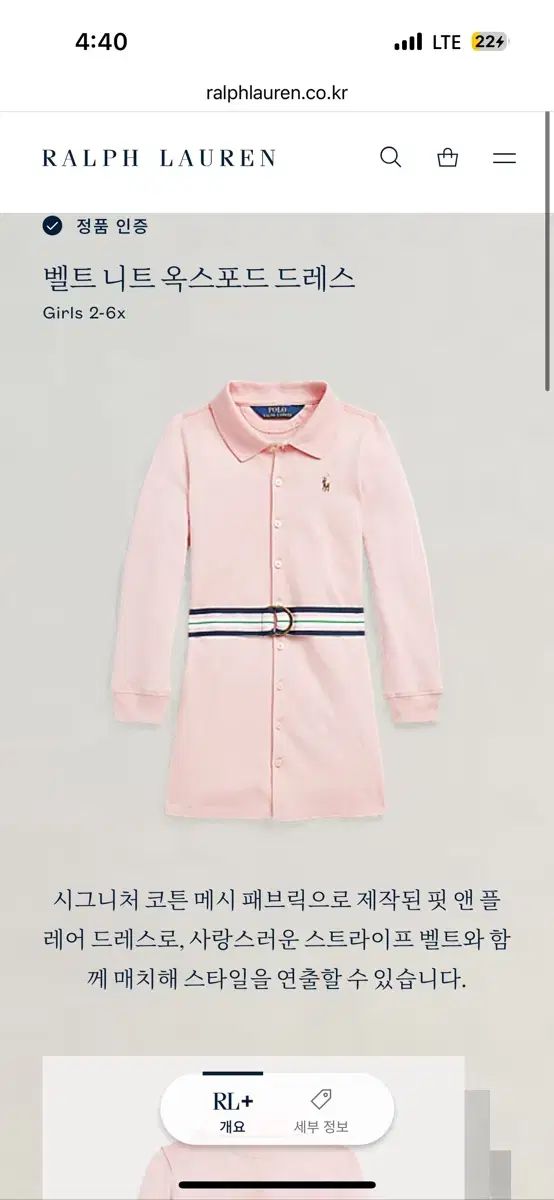 ポロ ラルフローレン 新モデル ベルト ONE PIECE 120サイズ QR Oxford(オックスフォード) 長袖 ピンク