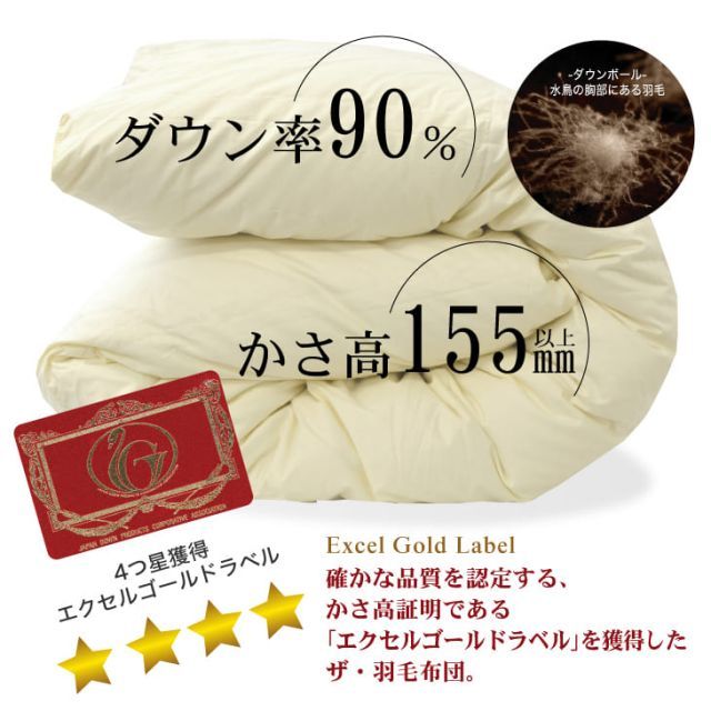 | 商品の特徴 | 「ザ・羽毛布団」 人気の6つのヒミツ ダウン率90% 新品羽毛布団 キングサイズ ザ・羽毛布団ツインキルト イングランドダウンとは、水鳥の胸元からのみ採取された羽毛のこと。その一つひとつをダウンボールといい、タンポポの綿毛のように軽く、空気を含むと、ふんわりしたボリューム感で軽くてあったか!また、吸湿、放湿性に優れ、汗や湿気を吸収発散し、一晩中~快適な寝心地で過ごせます。 新品羽毛布団 クイーンサイズ ザ・羽毛布団ツインキルトかさ高155mm以上 羽毛布団 キング 約230×210cm イングランド産ホワイトダックダウン90かさ高とはJISで定められた羽毛の試験による数値。高さ50cm内径29cmの円筒に、羽毛を30g入れ、上から120gの円盤を乗せて、2分後に底から円盤までの高さを測ります。それを「かさ高性」といい、かさ高の差が保温性の差となります。※かさ高は決して、ふとんの厚みのことではありません。 新品羽毛布団 キングサイズ ザ・羽毛布団ツインキルト イングランド羽毛はどこで生まれたの? 主な羽毛の産地は、ヨーロッパではポーランド、ハンガリーなどの東ヨーロッパ諸国とフランスで、アジアでは中国など。その他台湾や東南アジア諸国や北米、カナダでも採取されます。この中でも、ポーランド・ハンガリーなどが位置する北緯45度~53度は「ダウンベルト」と呼ばれ、良質なダウンが採れると言われています。 英国チェリバリー産ホワイトダックダウン イギリスの大自然の中での広大な農場で一羽、一羽大切に育てられ、丁寧に採取された良質のダウンを使用しています。 このダウンの特徴はダウンボールが大きく、かさ高性(FillingPower)が高いことです。またダウン1つ1つが大量の空気を含むことによって保温性に優れています。その性質を利用することにより、ふとんに使用する最適なダウンになっています。 このラベルの付いている製品は、イングランドチェリバリー産ホワイトダックダウンを使用したものである「原産地証明書」が付いています。 ダニや細菌も消滅、さらに羽毛本来のかさ高を発揮させる加工システム! 羽毛原料は正しい方法で洗浄処理をし衛生的でなければなりません。羽毛が輸入移送される時は、大量に圧縮されて届られます。 その圧縮された羽毛を羽毛本来の品質に復元させる加工システムです。 そして同時に、移送時に混入するファイバーやゴミ等を、綺麗に除去します。もちろん、高圧と高熱で、ダニや細菌も消滅させます。 最近のオイル方式を搭載したパワーアップ加工で、高熱処理された羽毛は、安定したかさ高を保ち、品質の良い羽毛布団を製造できるのです。 羽毛布団の品質は、羽毛を包む側生地によっても左右されます。羽毛のふっくら感や弾力感を存分に生かす軽さとやわらかさ。また小さく繊細な羽毛が飛ださないための「ダウンプルーフ加工」。さらに、羽毛の機能を生かすための「通気性」も必要です。 羽毛のふくらみを十分引き出すためにもキルト加工は重要です。 GFマークは信頼のマーク! 日本寝具寝装品協会の厳しいチェックを受け、ふとんの名称・素材・取扱い方法の統一表示基準に適合した商品にだけ付けられる信頼のマークです。 ご注文を頂いてから羽毛布団を作ります。側生地の縫製から羽毛の充填まですべて国内の工場で丁寧に行います。国内産にこだわり抜いた安心の日本製です。 この冬は、この羽毛布団一枚。 ご家族みんなで、この寝心地を体感してください。 商品名 ザ・羽毛布団ツインキルト(エクセルゴールドラベル)イングランド産ホワイトダックダウン90% サイズ キングサイズ(約230×210cm) 中素材 イングランド産ホワイトダックダウン90%、フェザー10% 側生地 超長綿60サテン 内容量 約2.0kg かさ高 約15.5cm(エクセルゴールドラベル) キルト ツインキルト ループ カバー留めループ8箇所付き(四隅、各辺中央部分) カラー 生成り 製造 日本製 商品番号:251-000054-10 |